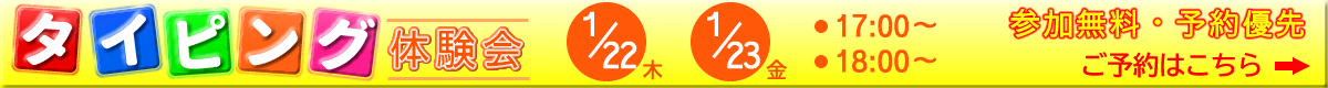 | 2026年1月14日 | 1月のタイピング体験会は22日(木)、23日(金)の2日間となります。ふるってご参加ください。お電話または専用フォームからご予約いただけます。 |